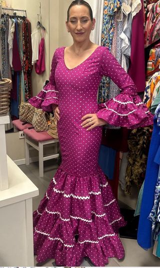 Traje de flamenca con un diseño de lunares blancos sobre fondo buganvilla. Ideal para ferias y celebraciones. - Mangas largas con volantes. - Falda con varios volantes y remates blancos. - Corte ajustado con volante en la parte inferior.