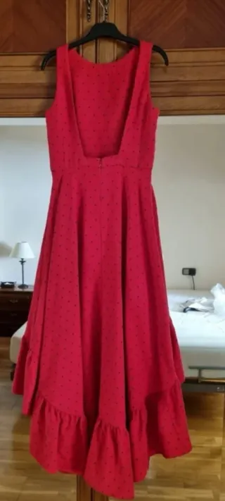 Vestido largo de Dolores Promesa en color rojo. Con espalda al aire - Diseño con estampado de lunares negros. - Falda con volantes y capas. - Detalle de rayas negras en la parte inferior. Diseño con aire flamenco en un tejido con cuerpo que da volumen al diseño. Da talla. Limpio con etiqueta del tinte.