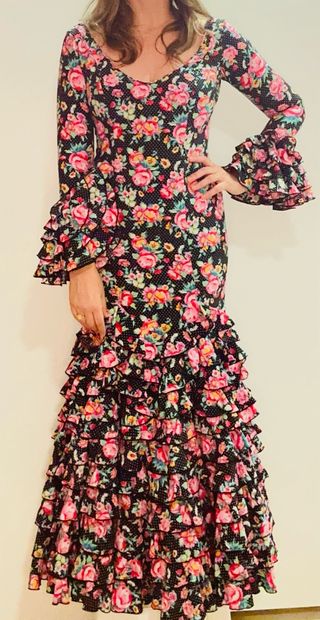 Traje de flamenca elástico con un estampado vibrante de flores y lunares. - Diseño ajustado. - Mangas largas con volantes. - Múltiples volantes en la falda.