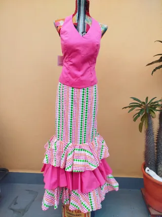 Traje de flamenca con un diseño vibrante y alegre, perfecto para ferias y eventos. Dos piezas - Cuerpo de color rosa fucsia. - Falda larga con volantes. - Estampado de lunares en verde, rosa y naranja sobre fondo blanco.