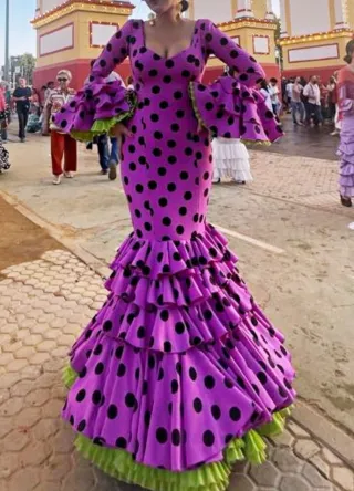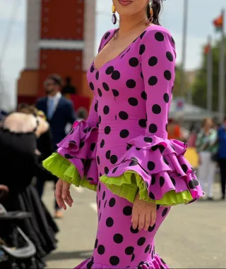 Traje de flamenca con un vibrante color lila y un clásico estampado de lunares negros. Diseñado con mangas de volantes con vuelo y falda de volantes con interior en color lima . - Mangas largas con volantes. - Volantes adicionales en el bajo del traje.( Mucho vuelo) - Detalle de volantes con borde verde lima en las mangas.