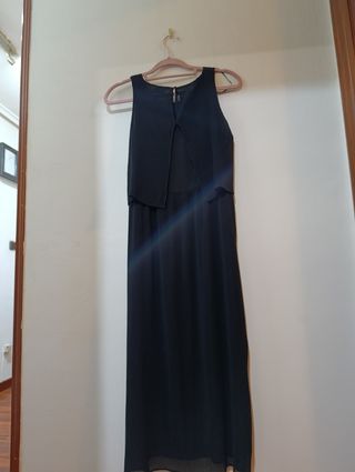 vestido largo de color negro. Presenta un diseño de dos piezas superpuestas, con la parte superior de tirantes y un acabado plisado. - Parte superior con tejido plisado. - Falda larga y fluida. - Diseño de dos capas.