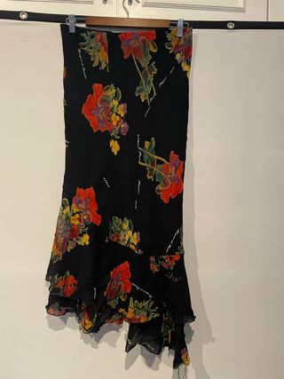 Falda larga con un vibrante estampado floral sobre fondo negro. Presenta un diseño asimétrico con volantes. - Estampado de flores rojas, amarillas y moradas. - Volantes en el bajo. - Diseño fluido y elegante.