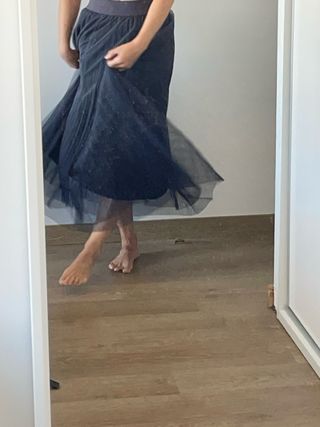 Falda larga de tul con estampado de topos. - Cintura elástica brillante. - Diseño de tul con pequeños puntos. - Largo hasta el tobillo.