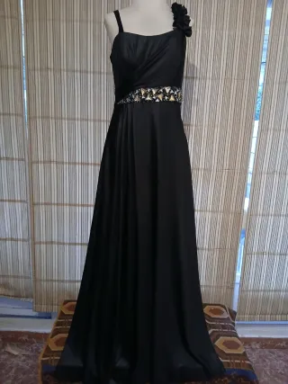 Elegante vestido largo de fiesta. - Diseño de un solo hombro con detalle floral. - Cintura adornada con pedrería dorada y negra. - Falda fluida y larga.