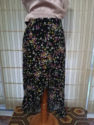 Falda larga con un estampado floral sobre fondo negro. Presenta una abertura lateral que le da movimiento. - Diseño con flores en tonos rosas y amarillos. - Corte asimétrico en el bajo.