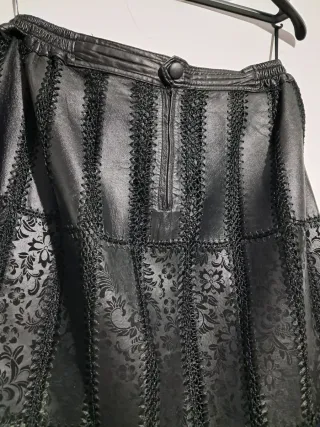 Falda larga de cuero natural en color negro+ chaleco Presenta un diseño patchwork con paneles de cuero liso y otros con un sutil estampado floral en relieve. Las uniones entre los paneles están decoradas con un pespunte decorativo. - Cierre de cremallera. - Largo hasta los tobillos. - Detalle de crochet en el bajo Precio Fijo!!