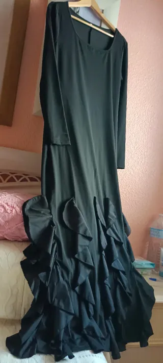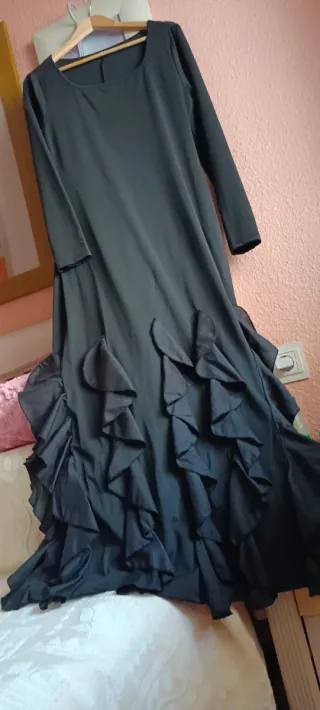 Elegante vestido largo negro con detalles de volantes. - Diseño de manga larga. - Falda con múltiples volantes. - Corte que favorece la figura. Vestido negro de de fiesta largo de corte andaluz ,vestido elástico enterizo , talla 40/42. elegante y moderno joven con volantes vaporosos .medidas : De sisa a sisa 50 cm. Contorno de cintura 84 cm Contorno de cadera 104 cm Largo 150 cm. Medidas tomadas con el tejido relajado . Gran escote redondo elegante .