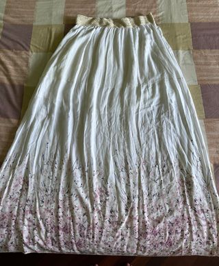Falda larga blanca con flores lilas y negras en el bajo. Con forro hasta las rodillas. Marca October de El Corte Inglés. Talla xl