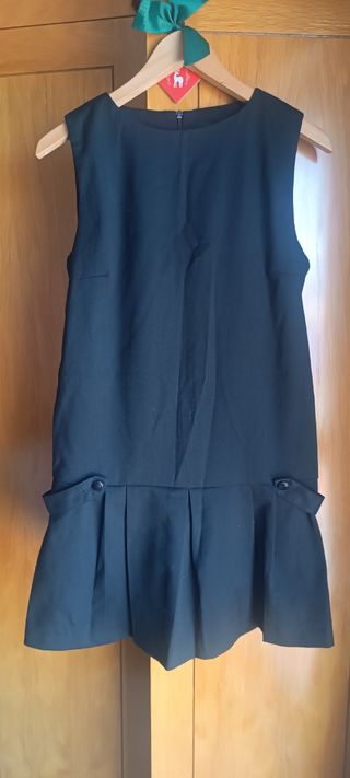 Vestido mini de manga sisa, cremallera invisible trasera, pequeño cinturón en la cadera y pequeñas tablas en ambos lados de la falda, sin forro. Talla M, 48 cm de sisa a sisa, 82 de largo. En perfecto estado, como nuevo. Para entretiempo, apto para llevar con o sin medias.