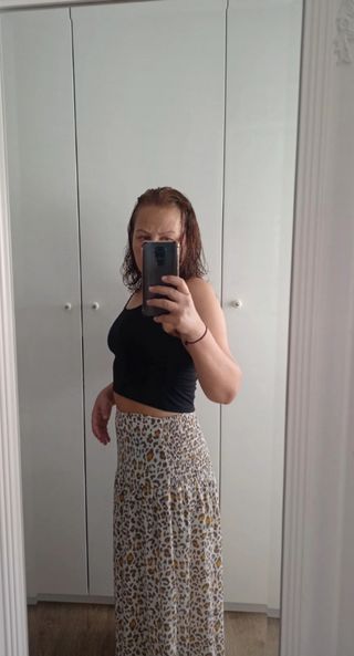 Se vende bonita falda larga de verano en talla L(40_42).Largo 93 cm y contorno cintura 82 cm y cintura de lado a lado 39 .En buen estado, usada muy poco .Da más talla pq tiene goma x detrás .El top corto negro es de shein en la talla L(40-42), es de poliéster y elastano. Tiene un ancho de sisa de lado a lado de 38 y un largo de 42.