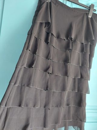 Preciosa falda negra de El Corte Inglés. Es una falda midi con varios niveles de volantes, creando un diseño elegante y sofisticado. Con forro. Largo: 76 cm. Ancho de cintura: 45 cm. - Diseño de múltiples volantes. - Caída fluida y ligera.