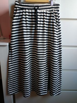 Falda larga con un diseño de rayas clásicas en blanco y negro. Es cómoda y versátil. Tiene bolsillos laterales. Da para una talla 36/38 - Cintura elástica con cordón. - Bolsillos laterales.
