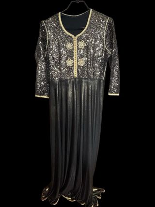 Elegante vestido largo con un diseño llamativo. - Cuerpo superior cubierto de lentejuelas plateadas. - Falda larga de tela negra brillante. - Detalles dorados en el escote y puños. - Adornos florales en la parte frontal.