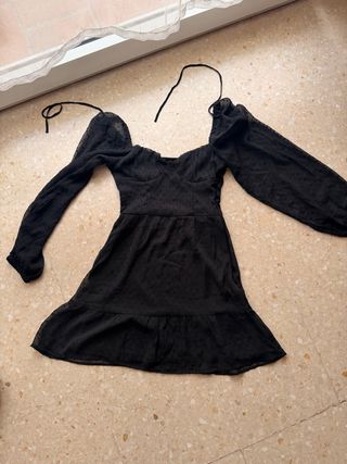 Vestido negro de H&M con un diseño elegante y moderno, la verdad es que es precioso. - Tejido ligero con pequeños topos. - Mangas largas abullonadas. - Escote corazón. - Falda con volante.