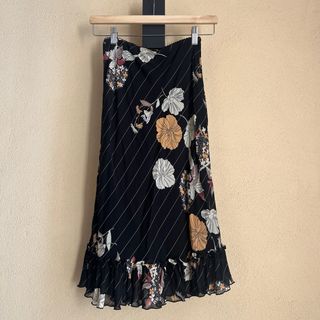 Falda larga con estampado floral sobre fondo negro. - Diseño fruncido en la parte delantera. - Estampado multicolor con flores pequeñas. - Corte recto y fluido. En buen estado