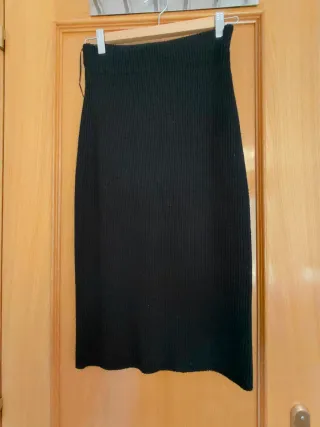 Falda negra de corte tubo. - Tejido elástico acanalado. - Diseño ajustado. - Largo hasta casi la rodilla.