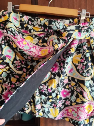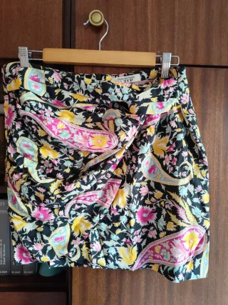 Mini faldacon un llamativo estampado paisley y floral sobre fondo negro. - Diseño cruzado y drapeado. - Tejido ligero y fluido,con forro interior. -Talla 40-L Cintura: 40 cm y largo 43 cm Colección Tamara Falcón para Pedro del Hierro. Sin estrenar. NO REBAJO, GRACIAS