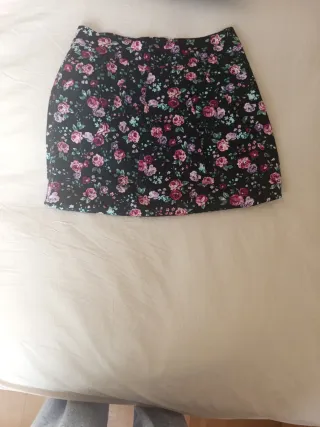Falda corta con estampado floral sobre fondo negro. Diseño moderno y versátil. - Estampado de flores en tonos rosas, morados y turquesas. - Corte mini. - Tejido ligero. Cremallera posterior Bolsillos laterales Pinzas en la parte delantera con una pequeña forma redondeada en la parte delantera que es un poquito más larga que la posterior