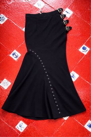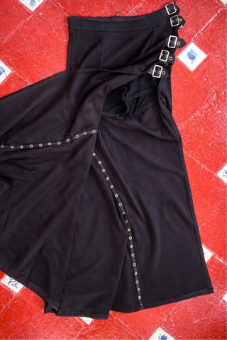 Falda larga de estilo punk o gótico en color negro. Presenta un diseño asimétrico con detalles de ojales metálicos a lo largo de un lateral y varias hebillas decorativas en la cintura. - Diseño asimétrico. - Ojales metálicos. - Hebillas decorativas.