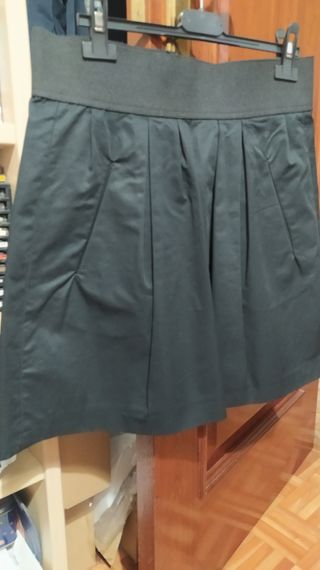 Falda nueva de Stradivarius. Se vende por no usarla. Es de algodón en color negro y efectos de desgaste. La talla es una 42. De largo mide unos 38cm aproximadamente. Tiene bolsillos laterales y los botones son de cierre normal.