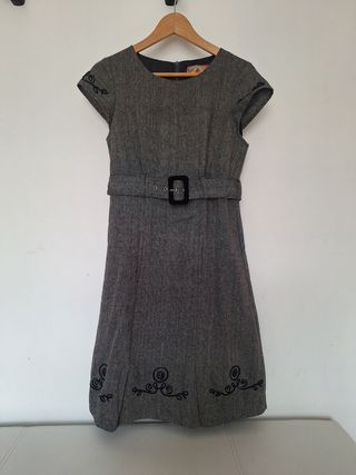 vestido gris de manga corta con detalles bordados en ante negro. Con bolsillos, cinto con hebilla en ante negro. Falda un poco acampanada. Poco usado. Marca: Rosalita Mcgee. Talla S Medidas: hombros 38.50 cm. Sisa 45 cm. Largo 97 cm.