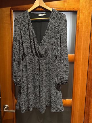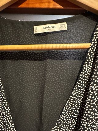 Vestido estampado de Mango con manga larga y escote en pico. El corte es entallado en la cintura y con vuelo en la falda. Te llevas otro de regalo de mi armario por el mismo importe - Estampado de puntos blancos sobre fondo negro. - Mangas largas abullonadas con puño. - Cierre cruzado en la parte delantera.
