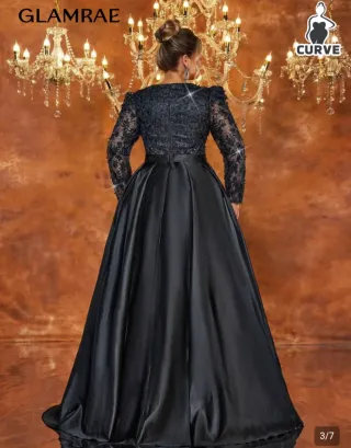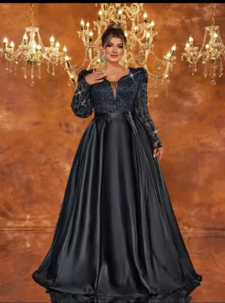 Vestido largo y elegante, perfecto para ocasiones especiales. Su diseño combina un corpiño con detalles brillantes y una falda voluminosa. - Corpiño con escote pronunciado y mangas largas adornadas. - Falda larga y fluida con caída. - Cintura marcada con una banda de satén.