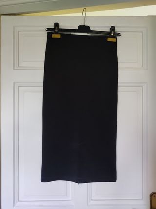 Falda midi de la marca Mango en color negro. - Talla 38 (M). - Diseño clásico y versátil. -largo 49 cm, cintura 40 cm