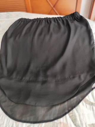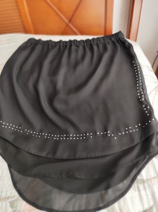 Elegante falda corta negra, perfecta para ocasiones especiales. Su diseño con pedrería le da un toque brillante. Tiene dos capas con largo diferente. La capa inferior tiene forma redondeada. - Detalle de pedrería en el bajo y en un lateral. - Tejido ligero y fluido. - Cintura elástica para mayor comodidad.
