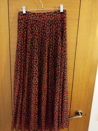 Falda midi plisada con estampado floral. Es ligera y con caída. - Diseño de flores rojas sobre fondo negro. - Largo midi. Es más bonita en persona.