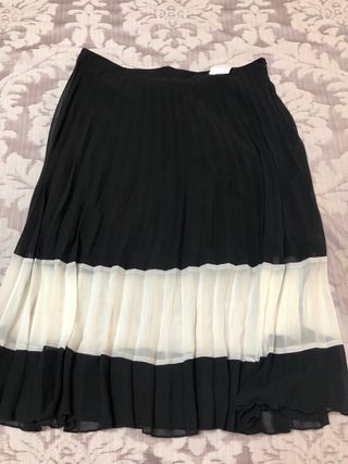 Falda midi fluida con diseño plisado. - Diseño en dos tonos: negro y blanco. - Largo midi. - Tejido ligero y con movimiento. - nueva, sin estrenar, con eriqieta.