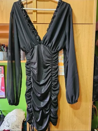 Elegante vestido negro con detalles de volantes en el escote y mangas largas de gasa. - Diseño fruncido en la falda. - Escote pronunciado en V. - Tejido con brillo sutil.