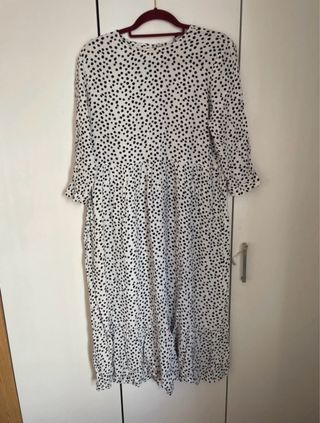 Vestido largo con estampado de lunares. - Diseño con cuello redondo. - Mangas largas con volantes. - Falda con vuelo y volantes. con una pequeña mancha de tinte de pelo, pero no se nota mucho