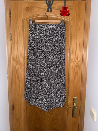 Falda larga con estampado floral sobre fondo negro, y abertura lateral Es una prenda semi nueva y cómoda. - Diseño de flores blancas. - Corte largo, con abertura lateral