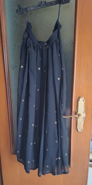 Prenda versátil de Zara con un acabado brillante que combina negro y plateado. Puede usarse como falda larga o como vestido. Talla XS-S (lo que indica la etiqueta) - Diseño con brillos. - Corte ajustado. - Tirantes finos que estilizan la cadera o bien para la parte superior si lo usas como vestido. - Corte midi si es vestido y en el otro caso es falda larga Yo me lo compré pensando que era un vestido y luego vi en la web que era una falda. Es muy útil al poder ser utilizado como ambas prendas. Ideal para una fiesta o un evento de una noche. Solo lo usé 2 veces y está en muy buen estado. Se me quedó pequeño.