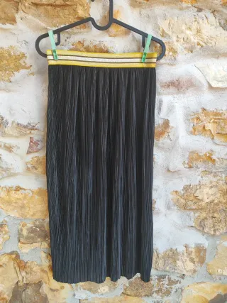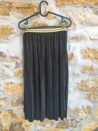 👉Falda larga plisada en perfecto estado. 👉Cintura elástica con goma amarilla que aporta un toque original y cómodo. 👉Talla M. 👉 Prenda muy versátil, ideal para usar en cualquier época del año: combínala con sandalias en verano o botas y jersey en invierno. #buenestado #falda #plisada #largafalda #versátil #modamujer #tallaM #looktodoelaño #cómoda #segundaestreno