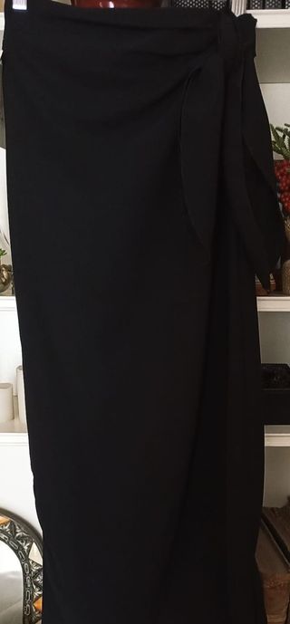 Falda larga de corte recto y cintura alta. Detalle de cordón lazo en la cintura. Forro interior, bolsillos traseros y apertura trasera. IMPORTANTE: Talla 40, pero da poca talla (pregunta medidas sin compromiso). Usado solo una vez.