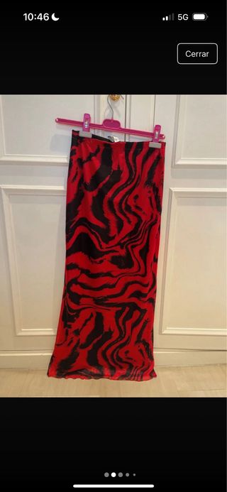 Falda larga con un llamativo estampado. - Diseño de rayas estilo tigre. - Combinación de colores rojo y negro.