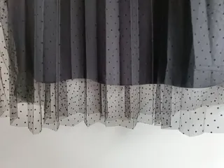 Falda midi de Lefties con tejido de tul plisado y estampado de plumeti. Utilizada en una ocasión. En perfecto estado. Medidas: cintura sin estirar 34cm / largo falda interior 73cm / largo capa plumeti 82cm. - Diseño plisado. - Cintura elástica