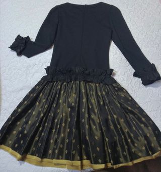 Precioso y elegante vestido de fiesta. Manga larga negra con detalle abullonado. Falda de raso en tonos negros y dorados. Cuerpo de punto. Cremallera parte trasera.