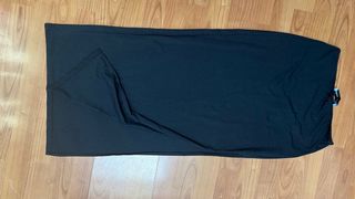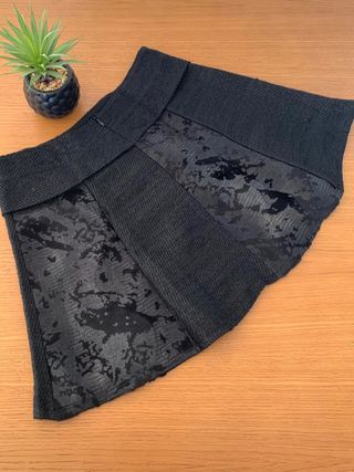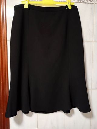 Falda negra larga acampanada de licra fuerte que moldea el cuerpo. Hay que verla puesta!! queda completamente pegada hasta la rodilla y de ahí se acampana mucho. Muy original y hace tipazo. muy elastica. vale para s y m.
