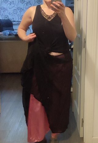 Elegante falda larga de color negro y rosa (hace como aguas). Sienta muy bien. Yo la compré para una boda y solo la puse esa vez. Está impecable. Viste tanto para ir a un evento elegante como para poner todos los días. Es una talla 50 pero no talla mucho (viene siendo una 44-46). Es de Punto Roma. En las fotos se aprecia el forro rosa y la tela de tul arrugado que la cubre. Es muy práctica, no necesita plancha.