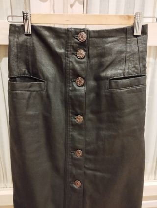 Falda tejido vaquero encerada color negro. Cintura: 32cm. Largo: 85cm. Apertura frontal con botonadura. Aberturas frontal y posterior. Puesta solamente un par de ocasiones. Excelente estado.