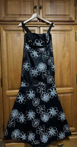 Elegante vestido largo con un estampado floral llamativo. Ideal para eventos especiales. - Diseño sin tirantes con detalle de escote. - Falda con corte sirena y cola. - Estampado de flores blancas sobre fondo negro.