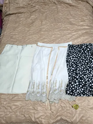 la persona que las llevaba media cintura 85- barriga 95 cadera 105, si están centimetros abajo arriba te vendra bien Conjunto de tres faldas de diferentes estilos y estampados. - Falda blanca lisa con detalles metálicos en la cintura. - Falda blanca larga con bordado floral y pasamanería dorada. - Falda negra con estampado de lunares blancos.