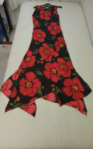 Elegante vestido largo con un llamativo estampado de flores rojas sobre fondo negro. Su diseño fluido lo hace ideal para eventos especiales. - Diseño sin mangas. - Falda con vuelo y cortes asimétricos. - Tejido ligero y vaporoso.