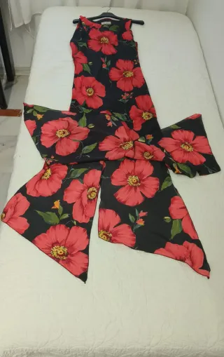Vestido largo con estampado de flores vibrantes. El diseño presenta un corpiño elástico fruncido y una falda fluida. - Corpiño elástico. - Estampado floral grande. - Mangas cortas a campanadas. Y mantoncillo rojo grande a juego. Sin el mantoncillo 20€