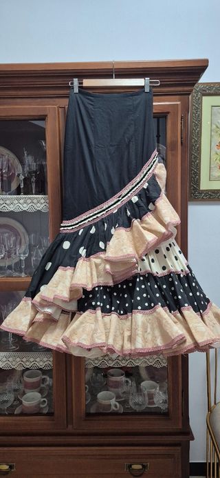 Falda larga de estilo español, ideal para conservatorio o actuaciones. - Diseño amplio y con vuelo. - Detalle de volantes en el bajo. Largo 58 cms. Cintura 57 cms.