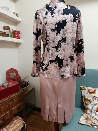 Elegante conjunto de blusa y falda. La blusa tiene un estampado floral en tonos rosas y negros sobre seda, con mangas largas. La falda, de color rosa, es de corte recto con pliegues en la parte inferior. - Prenda de vestir femenina. - Talla única. - Ideal para ocasiones especiales. Se puede vender por separado O
